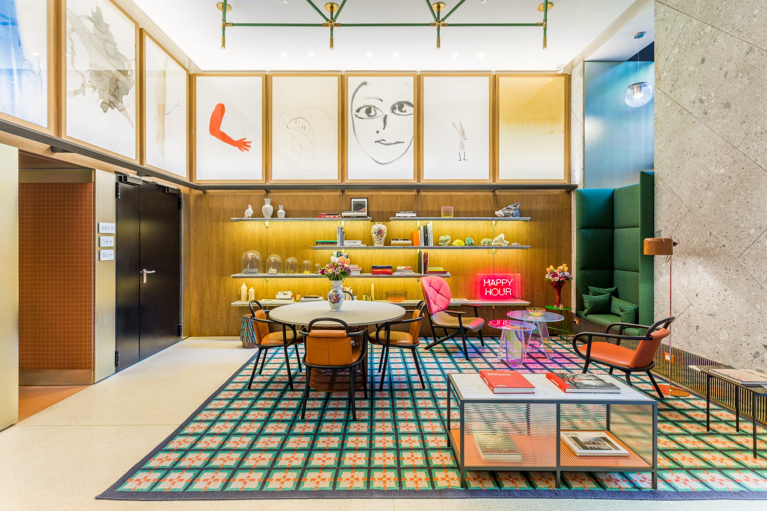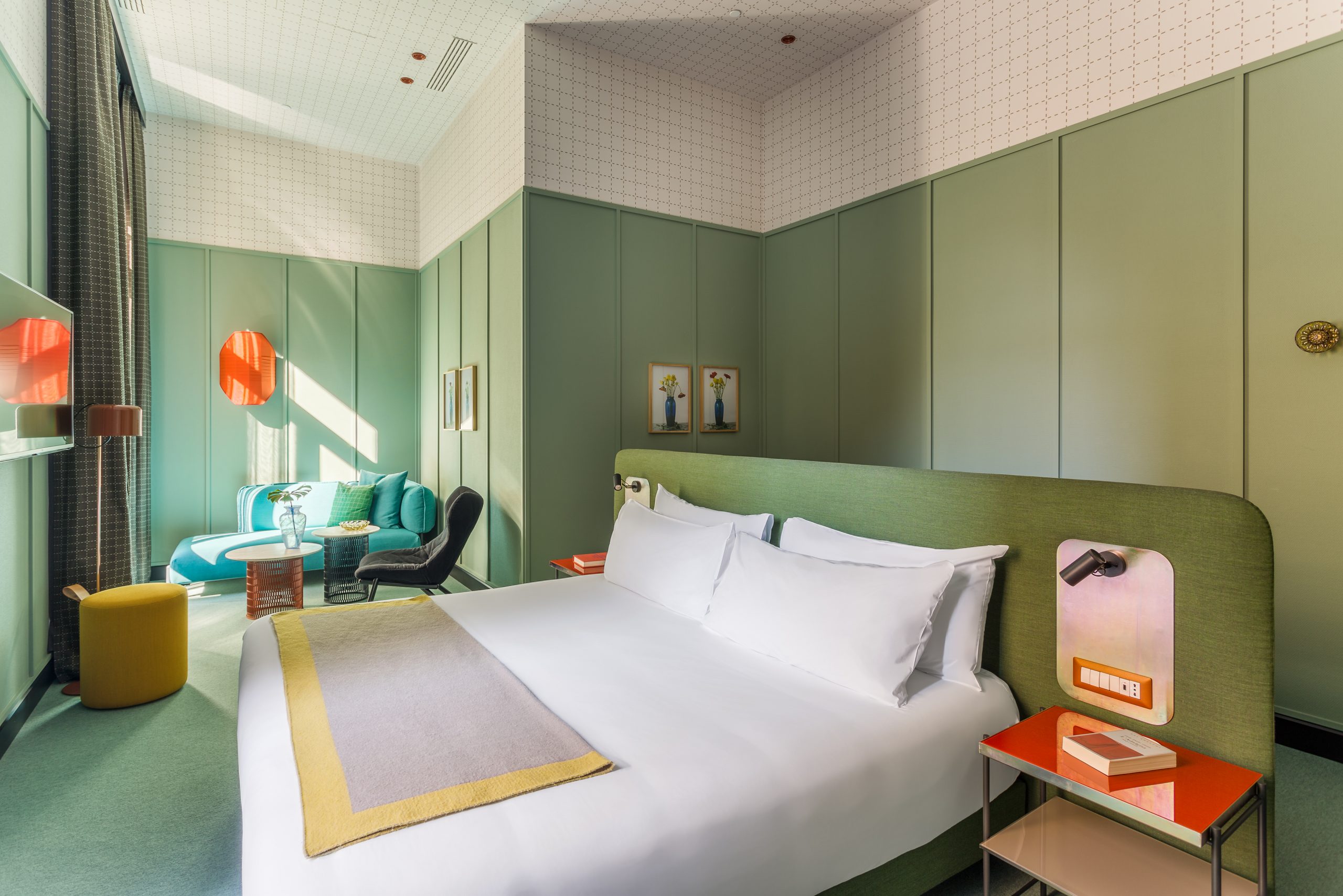 El suelo del vestíbulo del hotel es de mármol rosa, el mismo que se utiliza en el Duomo de Milán, siguiendo la línea de los últimos proyectos del diseñador español. El predominio de este color en su trabajo ha hecho que casi una de sus principales características. Los ladrillos de terracota, otra característica típica de la arquitectura milanesa, se utilizan en la pared curva del vestíbulo creando un efecto tridimensional. Los recurrentes patrones geométricos reflejan el rigor de la ciudad y también se refieren a las artes gráficas, un elemento importante de la historia cultural de Milán. Las habitaciones se refieren a los típicos espacios domésticos italianos, con un toque vintage.