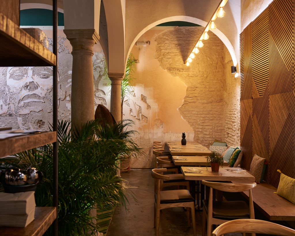 Este espacio de gastronomía que cuenta con una decoración única abrió sus puertas en el año 2017 y se ha convertido en uno de los lugares mas chic de la capital hispalense.El proyecto es obra de tres socios una italiana Sarah que recrea el ambiente de la Toscana y dos sevillanos Juan y Victor Fortuna propietarios de la Vida es Tapas. Es sin duda una creación de los interioristas de CM4, en el Centro de Sevilla con techos decorados con moldes en colores tierra y verdes, un jardín vertical dónde la decoración es el elemento predominante. y un patio estilo sevillano con arcos de medio punto. El artista lis (Whils) ha diseñado el rostro de una mujer esculpido a cincel en la pared del fondo del patio principal. Las mesas y sillas de maderas consiguen que el ambiente sea cálido por su tonalidad.El segundo espacio dispone de una barra decorada con azulejos en verde esmeralda .El patio y la cocina la cocina vista tienen un suelo de cerámica en espiga, esmaltada en distintos tonos de verde. Estos detalles consiguen una atmósfera idílica.